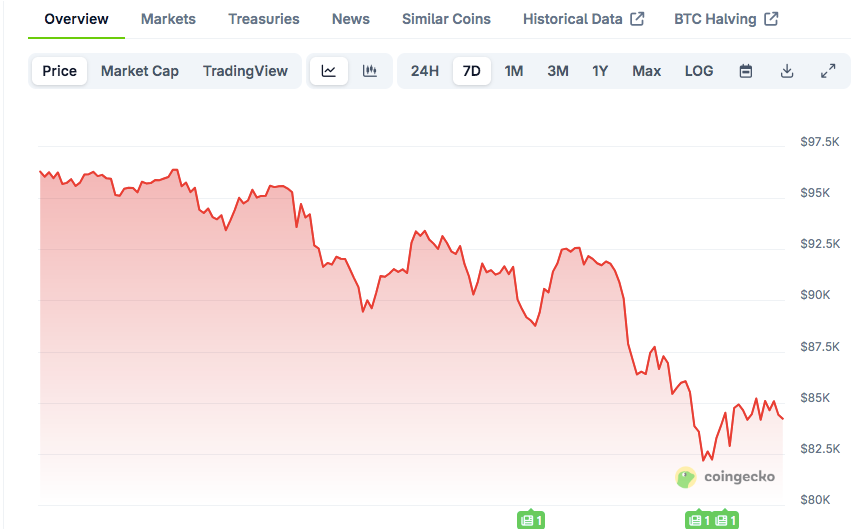 截至发稿,CoinGecko数据显示比特币交易于84,197美元附近,日跌幅1.77%,周内跌幅达12.30%。这使得现价正接近ITTech所述的新入场者压力区间。