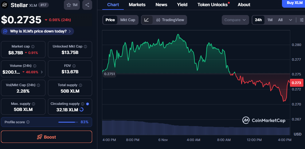 恒星币(XLM)价格在早盘上涨后回落,过去24小时内最低触及0.27美元水平。该代币在触及0.28美元区域后承压下行,图表显示后期交易时段抛压加剧。整体走势反映出市场交易活跃度正在降低。