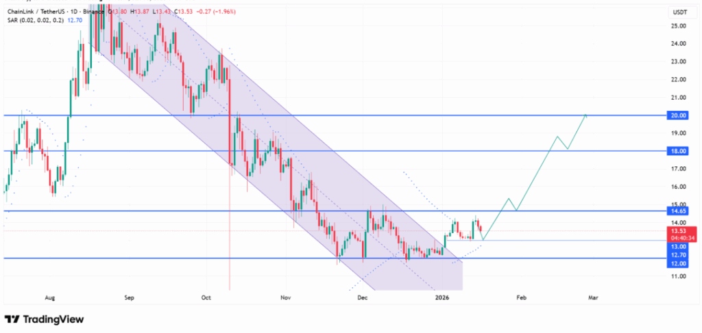 LINK已脱离先前下跌趋势,目前交易于12美元至14.65美元之间的明确区间内。过去抛售的有序性已让位于更稳定的价格行为,当前交易价格约13.53美元。下降通道已被打破,但价格仍受限于既定的水平区间。市场焦点已从趋势延续转向条件构筑。