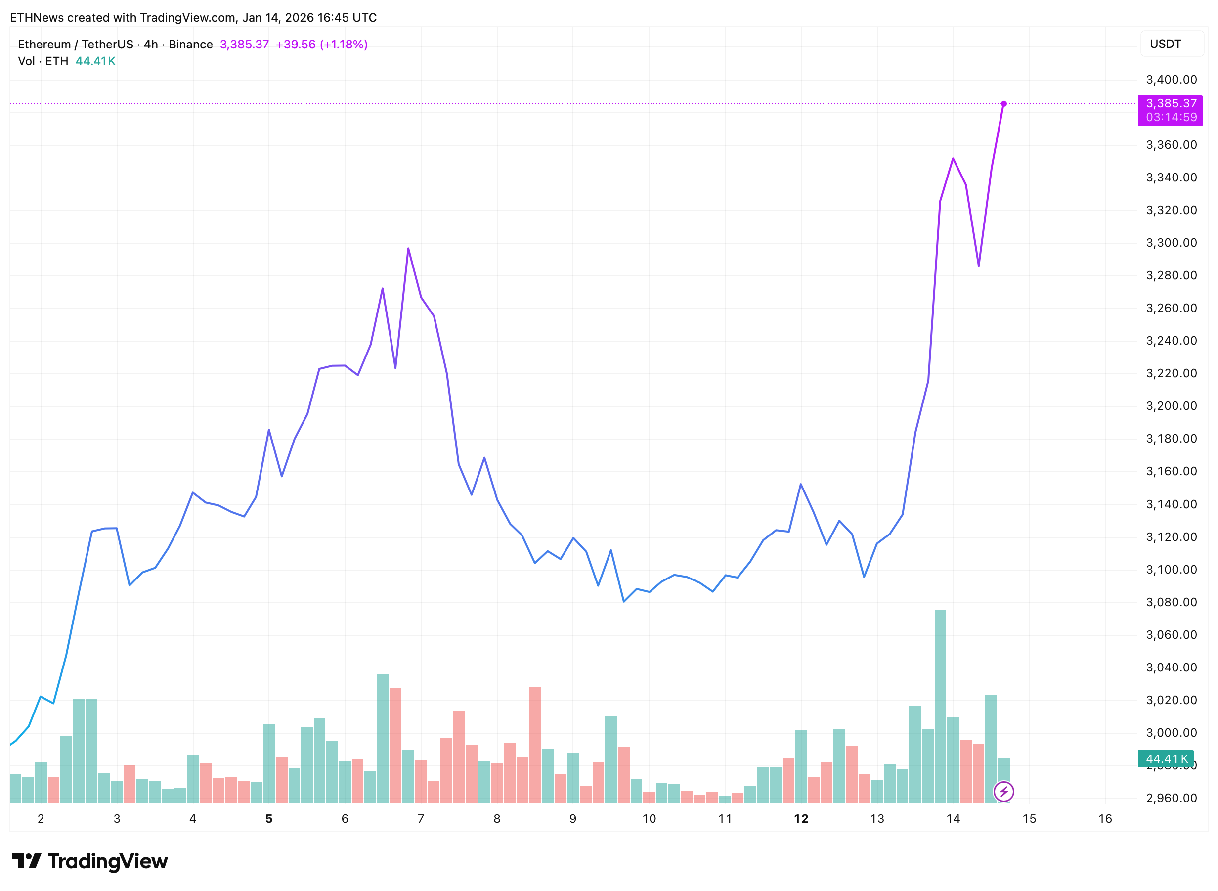 供应紧缩、强制平仓与支持性宏观数据共同推动以太坊进入更高交易区间,价格在最初飙升后未出现回落,仍维持在日内高点附近。