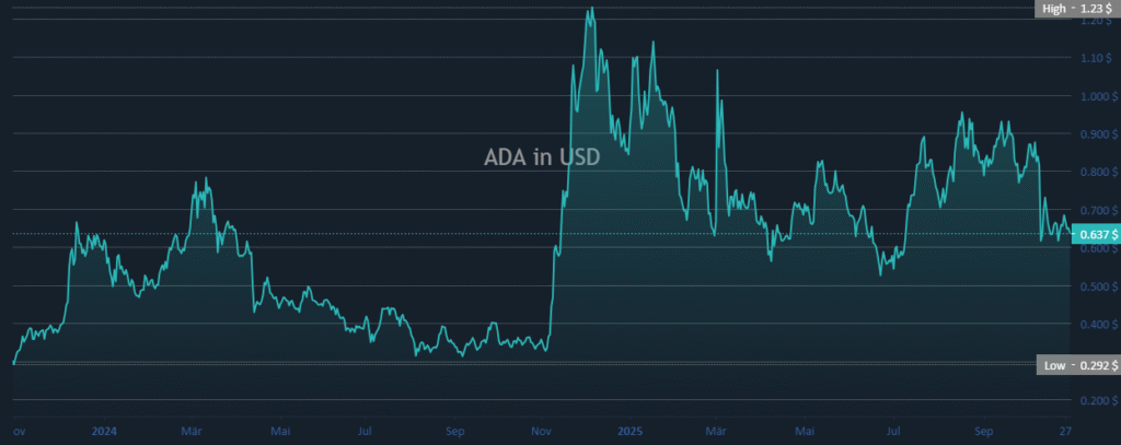 卡尔达诺(ADA)在经历剧烈波动的一年后,价格稳定在0.63美元附近。尽管市场多次回调震荡,该加密货币在2024至2025年间展现出惊人的韧性和持续积累能力。0.60至0.70美元的交易区间不仅体现了其市场成熟度,更凸显了充足的流动性和强劲的结构性支撑。随着网络创新和区块链采用率的提升,ADA正为下一轮上涨周期蓄力。