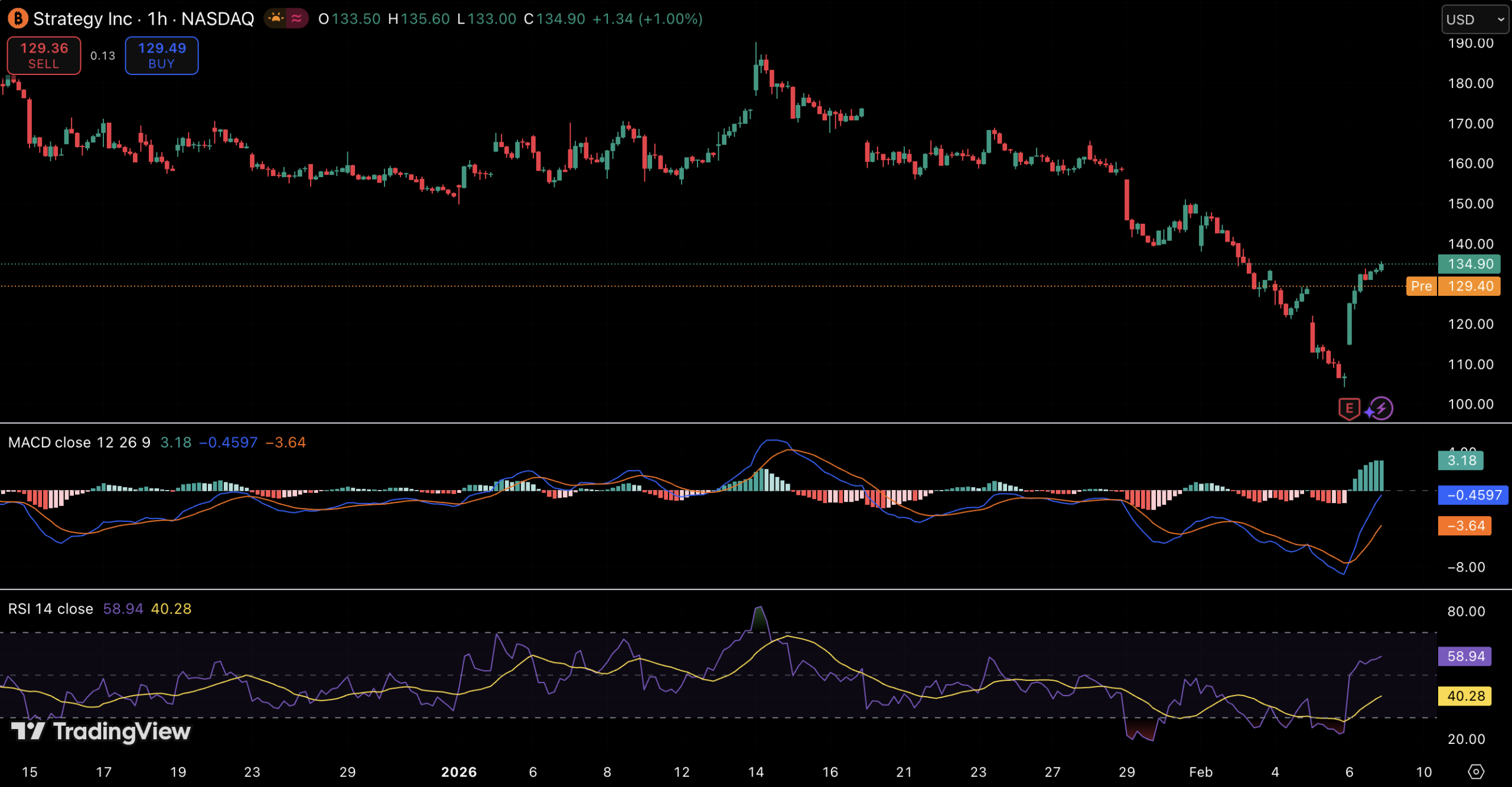 从技术角度看,Strategy 的图表显示出潜在趋势反转的迹象。在确立局部底部后,股价大幅反弹,重新站上 130 美元区域——该区域此前是关键支撑位。