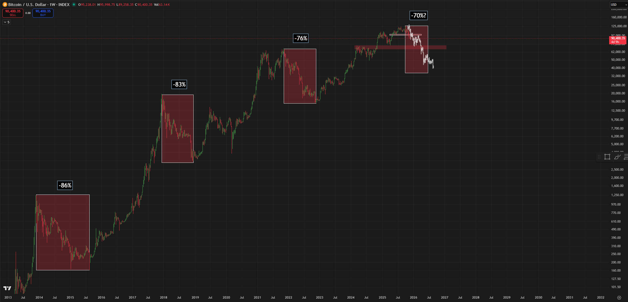 曾精准预测本次下跌的Roman Trading表示:"如图表所示,比特币在熊市中通常下跌约80%。若延续此趋势,市场底部将在30,000至35,000美元区间。个人认为不会跌至如此低位,计划在50,000美元附近开始定投。"