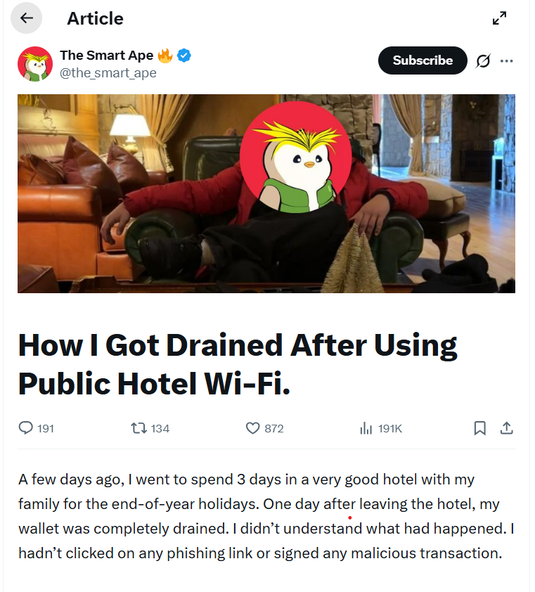一位名为The Smart Ape的加密货币用户称,他在酒店住了三天后,热钱包损失了约5000美元——并非因为点击了钓鱼链接,而是由于犯下一系列“愚蠢错误”,包括连接开放WiFi、在大厅接听电话,以及批准了一条看似普通的钱包请求。