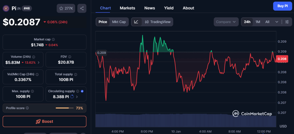 在最新升级消息发布后,原生代币派币始终在0.208至0.209美元区间波动,未见明显涨跌。截至撰稿时,其24小时交易量下降近14%,表明当前的生态系统进展未达市场预期,尚未引发即时价格上扬。不过,相较于2025年10月创下的历史低点0.1585美元,当前价格仍高出31.69%。