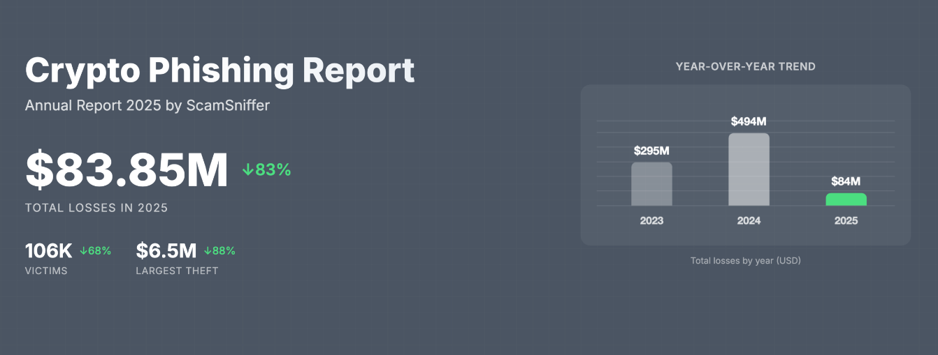 2025年,加密钓鱼诈骗损失额下降了83%,从2024年的近4.94亿美元骤降至8385万美元。受害人数和大规模盗窃事件也有所减少。