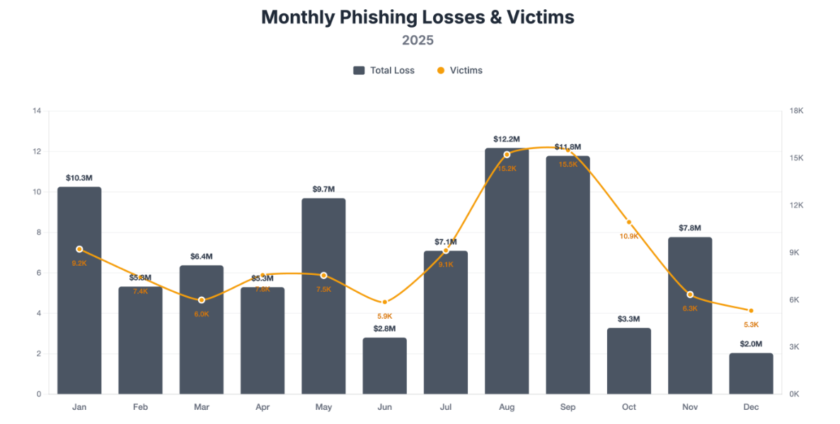 超过100万美元的大规模盗窃案也变得更为罕见,从2024年的30起降至2025年仅11起。月度损失数据揭示了钓鱼攻击如何跟随市场活动波动:损失最少的12月仅为204万美元,而在以太坊经历年内最强劲反弹的8月,损失额达到1217万美元。