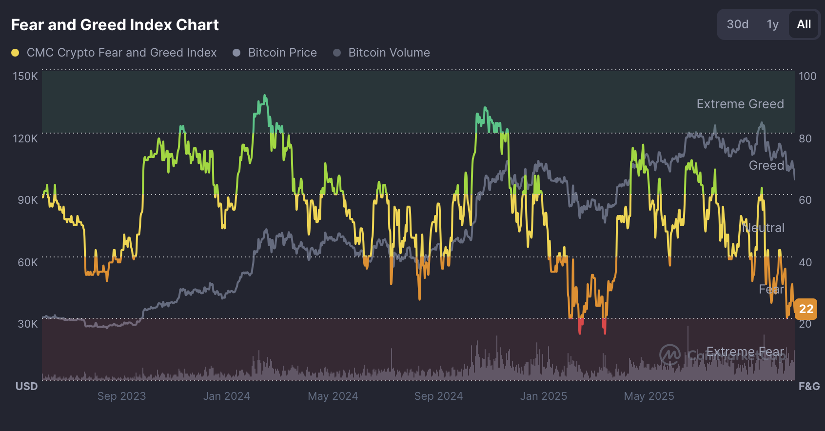 当前宏观背景仍是市场最主要的看跌力量。CMC恐惧与贪婪指数报22/100,处于"极度恐惧"区间,在此情绪下交易者通常会规避包括BNB在内的交易所关联资产等投机性押注。