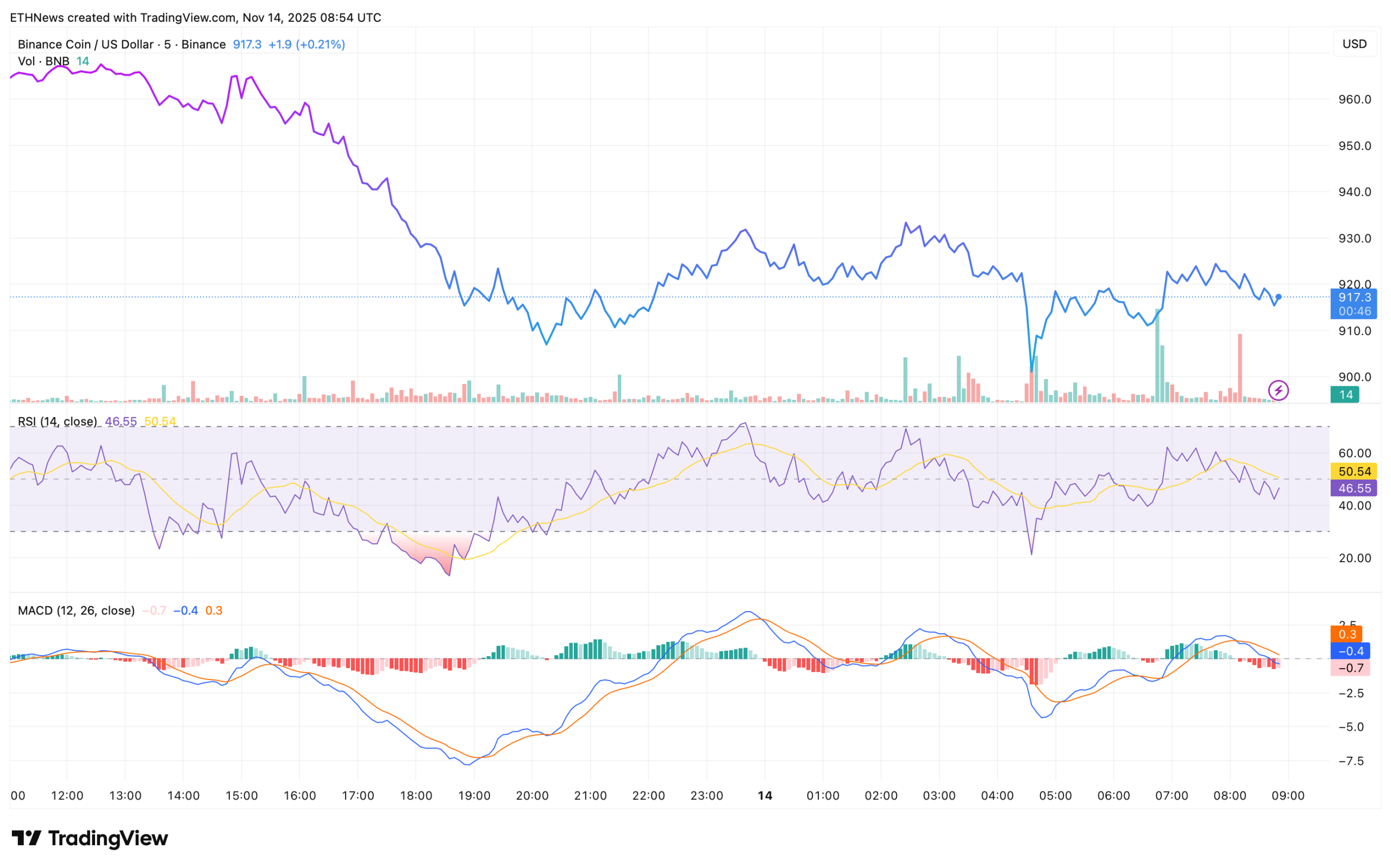 随着加密货币市场在宏观压力加剧和技术面恶化的双重夹击下持续承压,BNB价格跌至917美元,延续了多日下跌走势。此番下跌使BNB本周累计跌幅达4.95%,其市值缩水至1263亿美元,而由于波动加剧,交易量飙升39.4%。