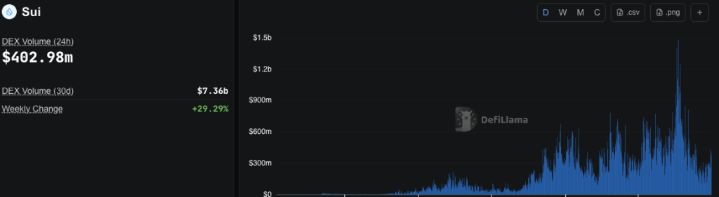 Sui去中心化交易所(DEX)交易量呈现显著增长,近一周涨幅达29.29%,24小时交易量突破4.0298亿美元。这一数据强烈预示着投资者对Sui网络的关注度正在升温。