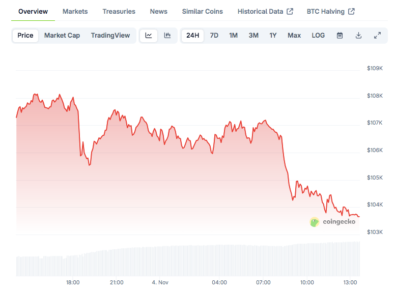 CoinGecko数据显示,截至发稿时比特币报价103,705美元,24小时交易量超840亿美元,过去24小时下跌3.28%,周跌幅达9.34%。