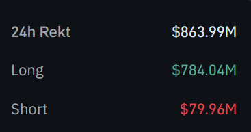 加密货币总市值下跌近2.8%,清算数据则描绘出更严峻的图景:单日清算金额接近8.64亿美元,其中多头头寸占压倒性的7.84亿美元。