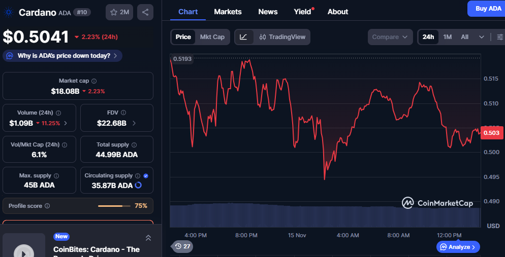 短期图表显示,ADA在今日微跌后交投于0.50-0.51美元区间。上一交易时段开盘报0.519美元后,价格呈现阶梯式下行走势。目前处于日内区间的下半部分,反映出持续的卖压。