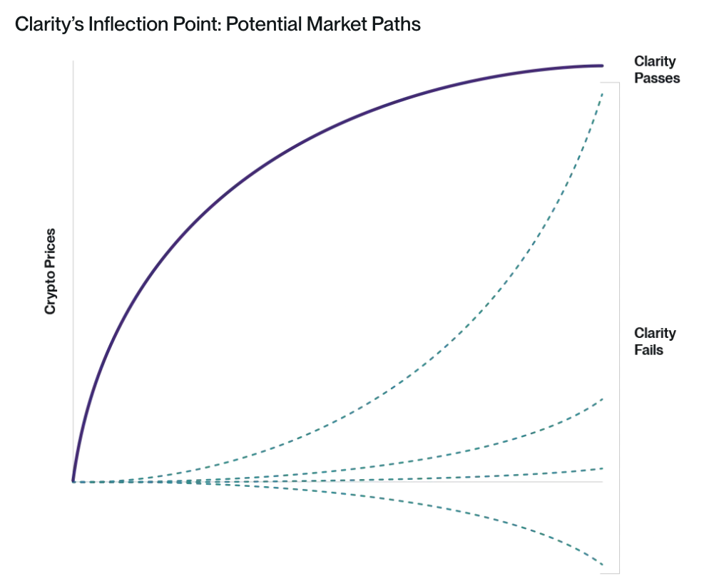 Hougan强调该法案的通过与否"将对短期价格回报产生重大影响","这将导致市场走向两条截然不同的道路:一条是基于强劲预期的早期牛市,另一条是任何乐观情绪都必须与长期监管摩擦和质疑抗衡的'观望型'市场。"