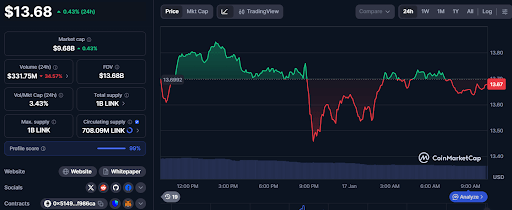 随着2026年的开始,Chainlink显示出强劲势头。LINK交易区间在13.15美元至14.14美元,稳固持于20日移动均线上方。技术信号正转为积极,MACD柱状图达到0.1719。此结构为大幅走高开辟了清晰路径。技术分析预测,若能在高成交量下突破13.61美元阻力位,Chainlink价格有望在一月下旬向15.50美元突破。
