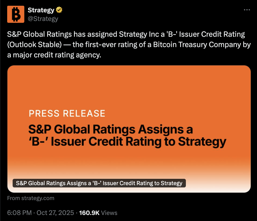 这是传统金融领域的历史性首次。标普此前从未对比特币为核心的资产公司进行官方评级,这为华尔街评估比特币高敞口企业树立了先例。