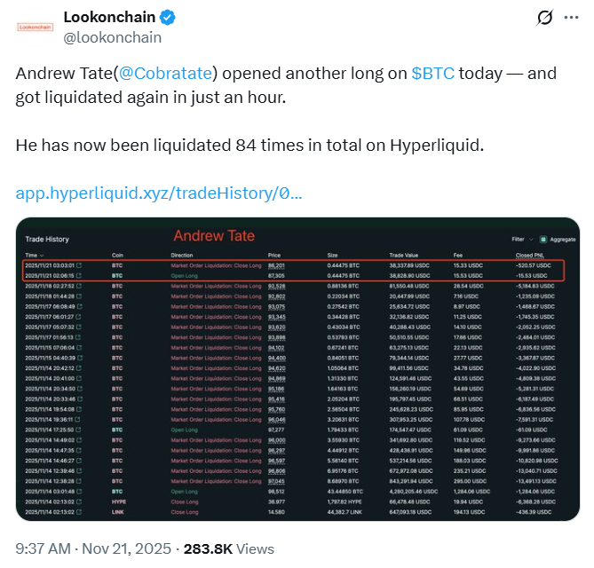 随着价格波动加剧,更多巨鲸级交易者面临亏损。Lookonchain报告显示,安德鲁·泰特在Hyperliquid平台新建比特币多头头寸,一小时内再遭清算。这已是其在该平台第84次被强制平仓。该事件凸显即使大型交易者在高杠杆操作中也难以应对价格剧烈波动。