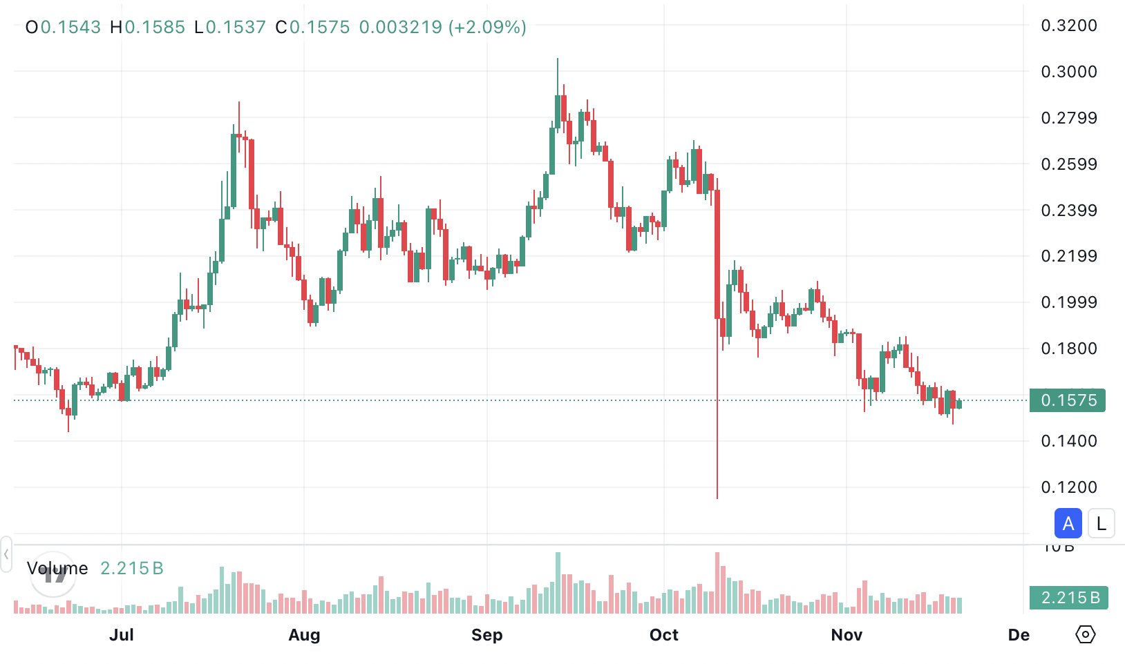 从技术面看,跌破斐波那契0.5回撤位预示DOGE可能滑向0.145-0.140美元区间。但相对强弱指标(RSI)显示低点逐步抬高,异同移动平均线(MACD)动能衰减,暗示抛压正在减弱。