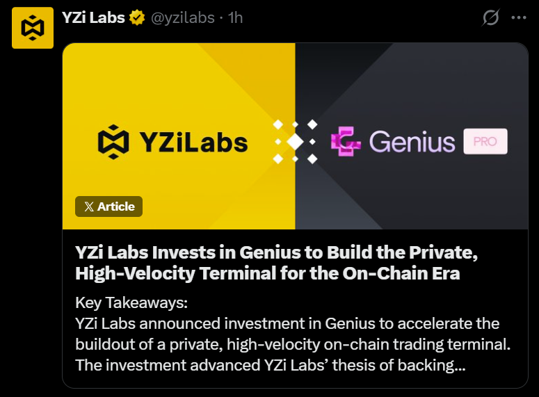 YZi Labs将此动态列为其支持Genius Trading的原因之一。该平台致力于整合主要区块链网络的交易,同时为专业交易者优先保障执行质量与隐私性。
