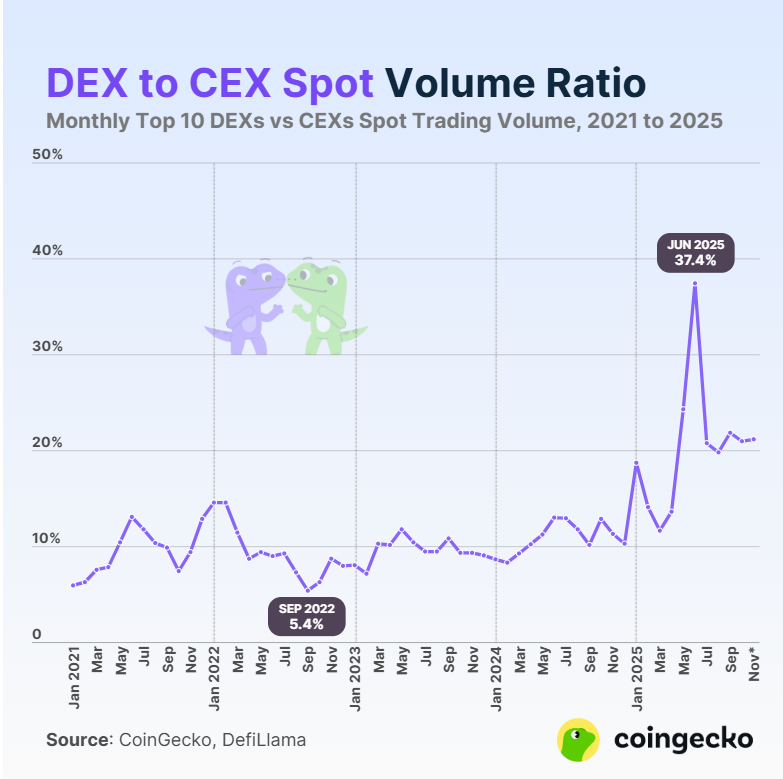去中心化交易所与中心化交易所的现货交易量比率于去年六月达到峰值,并随着加密货币交易量在去中心化交易所的持续增长而保持上升趋势。
