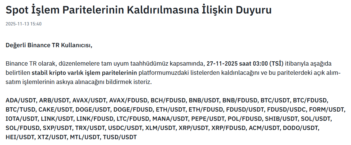 近期币安全球站与币安土耳其站之间强制实施账户验证。最新公告则宣布将大规模下架美元稳定币交易对。自土耳其时间11月27日凌晨3点起,用户将无法继续通过这些稳定币交易对买卖山寨币。