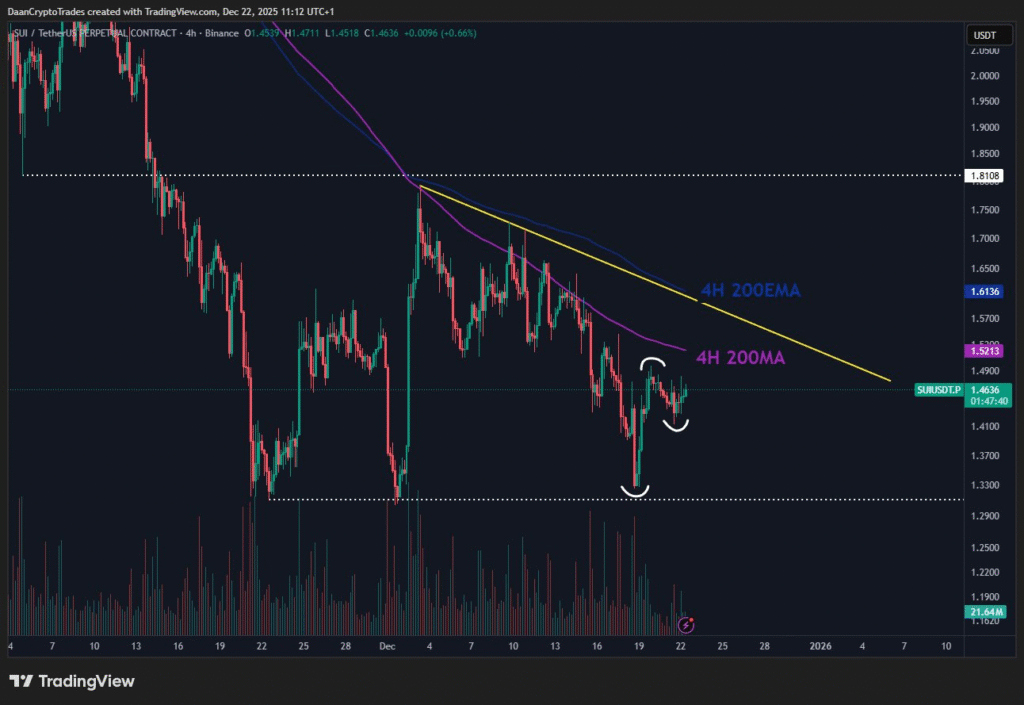 Sui在过去24小时内上涨2.35%,价格达到1.47美元。尽管涨幅显著,但Sui仍处于限制进一步走势的关键技术区间内。