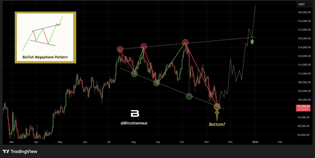 分析师指出比特币图表上正在形成扩大楔形模式,显示可能出现看涨形态。交易者正密切关注关键支撑位和阻力位,当前结构可能引导价格向145,000美元突破。