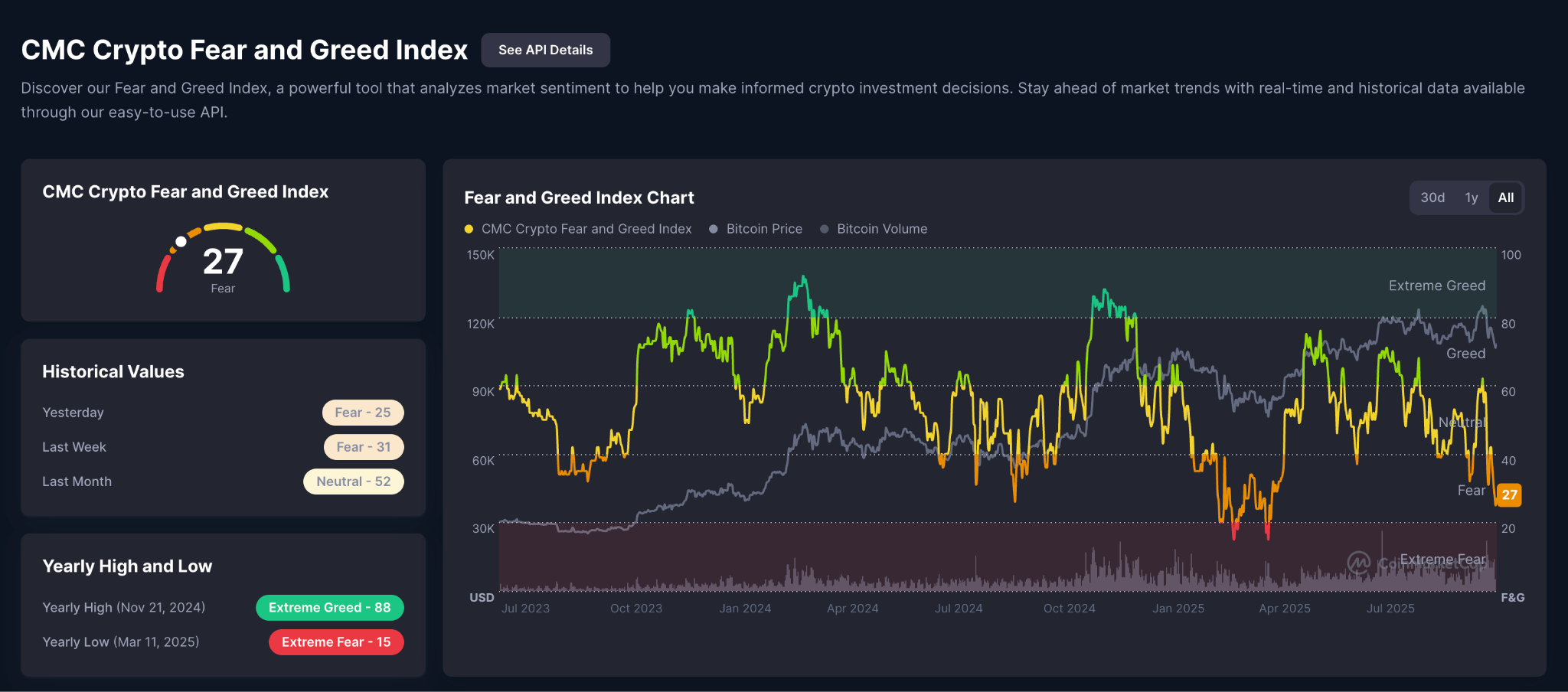 市场情绪再度低迷 CoinMarketCap恐惧指数跌至27 但交易者已发现机遇