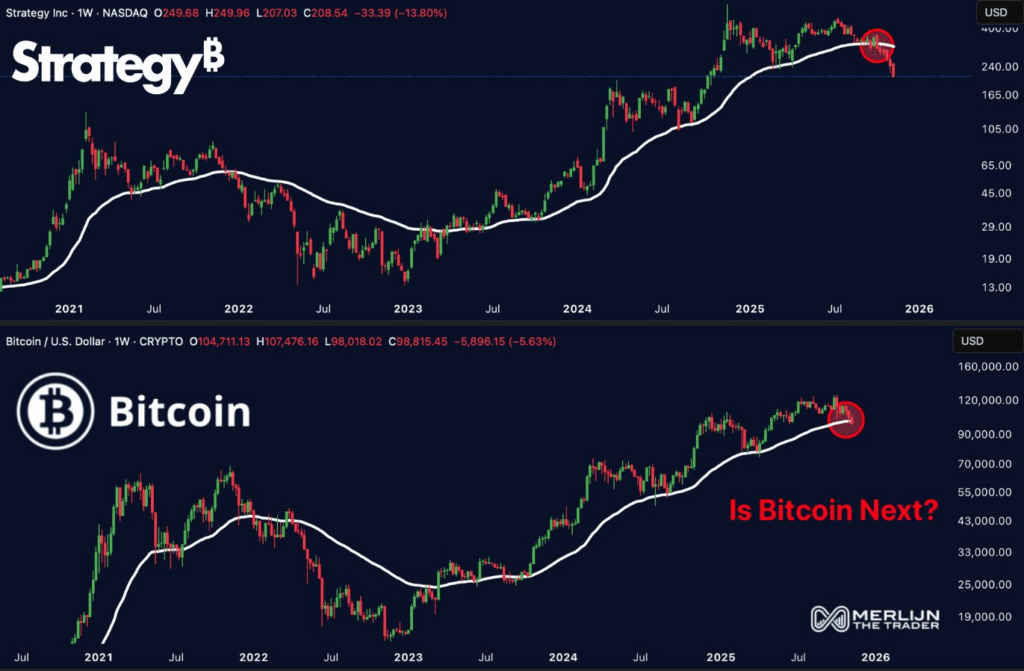 比特币价格与微策股票走势对比 | 来源:交易员Merlijn,X平台