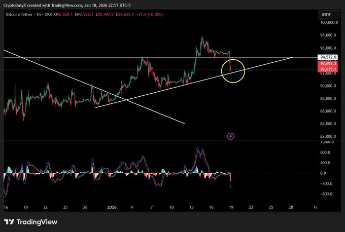 据加密货币分析师Crypto Busy称,当BTC/USD价格徘徊在92,600美元附近时,一次快速下探扫清了附近的流动性,并触及了买家已多次防守的上升趋势线。