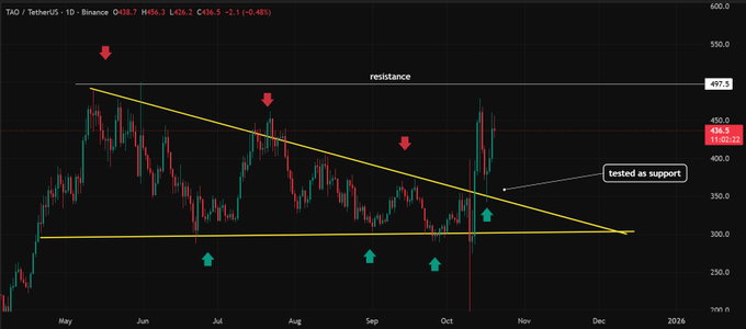 分析师Lark Davis(@TheCryptoLark)指出:"$TAO刚完成下降三角向上突破,前阻力位已成功通过支撑测试。"这一观察与现行盘整形态相符——尽管日线表现降温,但结构完整性依然保持。