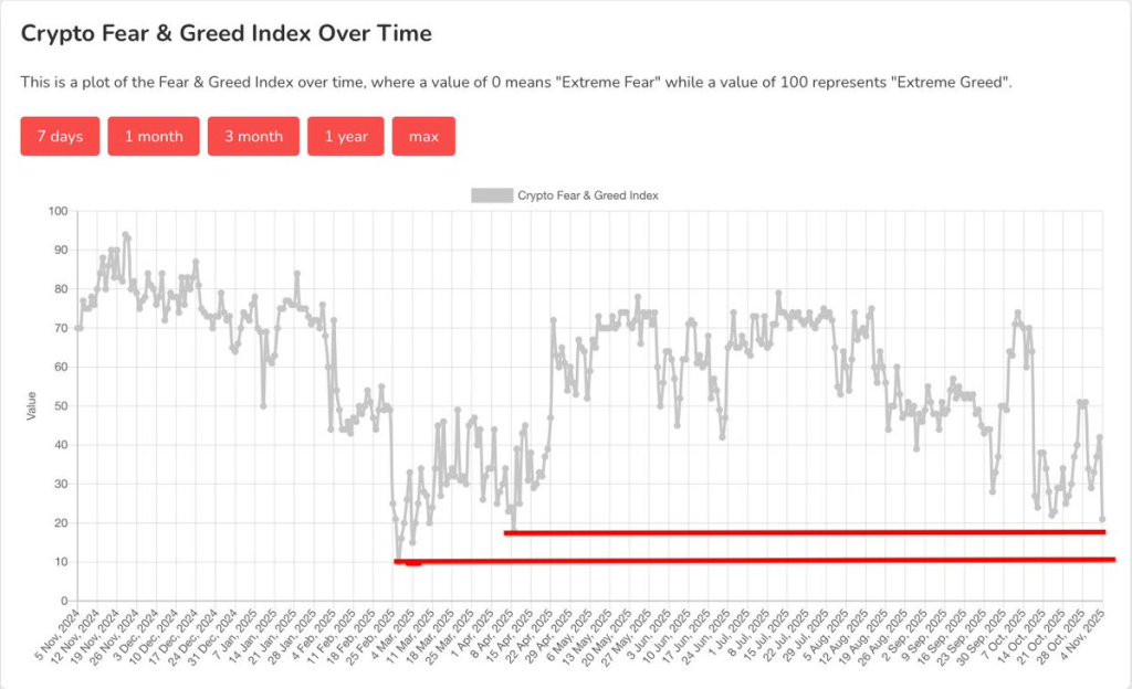 比特币下跌3%,恐惧指数接近历史反弹启动的底部区域;周线布林带破位与RSI趋势显示市场或接近衰竭;交易员密切关注10万美元支撑位,情绪指标与成交量暗示可能进入积累阶段。