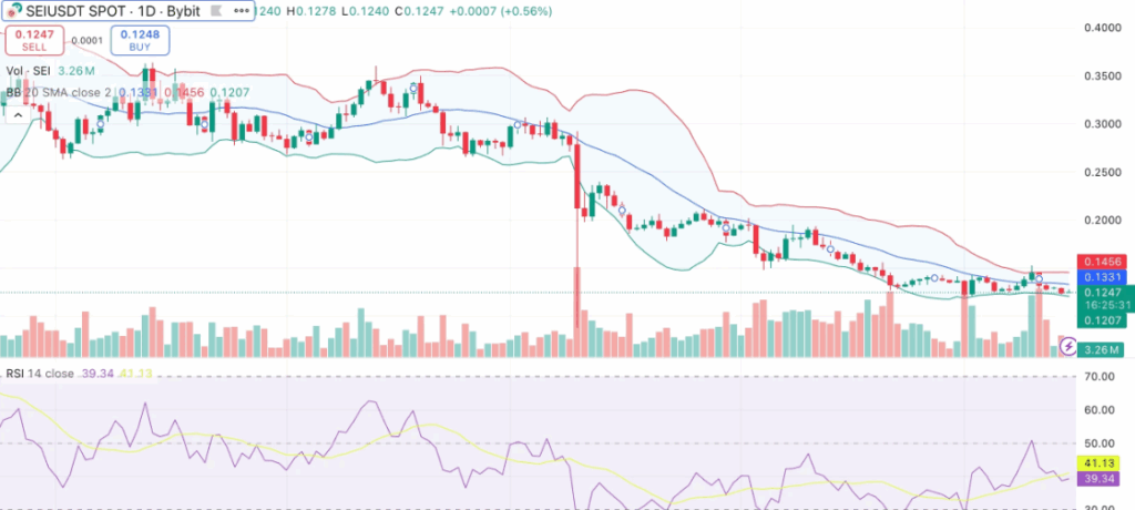 从技术面看,Sei 仍处于中期下跌趋势中。该代币一直未能突破 0.28-0.30 美元阻力区,持续形成更低的高点和更低的低点。近日,价格在 0.12 美元至 0.13 美元之间波动,表明尽管抛压可能已经减弱,但趋势尚未逆转。此前在抛售期间扩大的布林带现已收窄,表明波动性降低。20 日移动平均线一直构成阻力,阻止了显著反弹,而交易量表现不一,进一步反映了市场的不确定性。