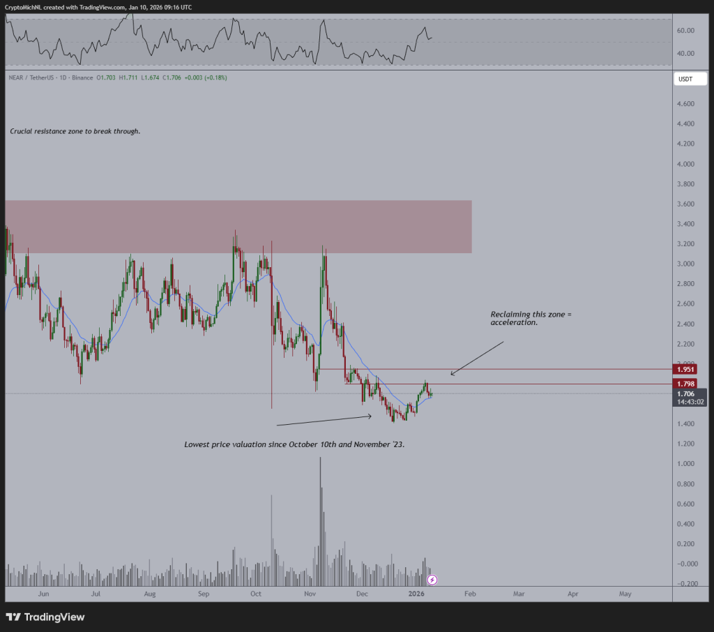 从Michaël van de Poppe分享的日线图来看,市场普遍关注的关键阻力位于1.95美元区间。NEAR价格已在此多次承压,表明该区域仍是重要关卡。若买方犹豫不决,价格可能在此停滞;但若能将其转化为支撑,则有望启动更强势的上涨。