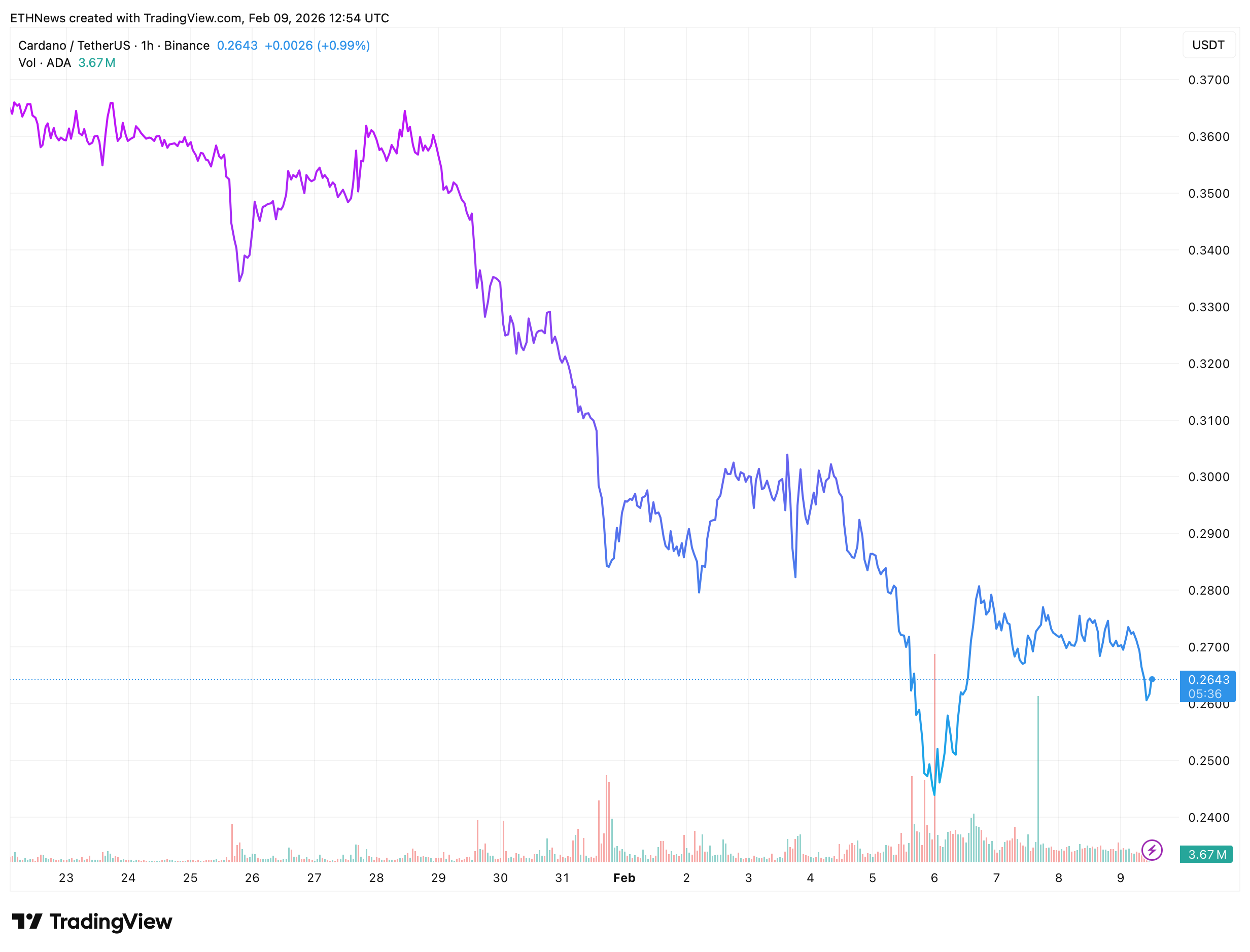 ADA自震荡区间破位后未能收复关键水平,卖压仍是当前市场主导力量。根据最新图表数据,ADA目前交易价格约为0.2643美元。