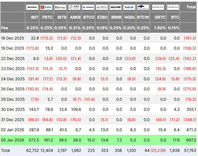 根据Farside Investors的数据,在2026年第二个交易日(周二),美国比特币现货ETF获得了价值6.97亿美元的资金流入,使得新年头两天的净正向流入总额超过11亿美元。