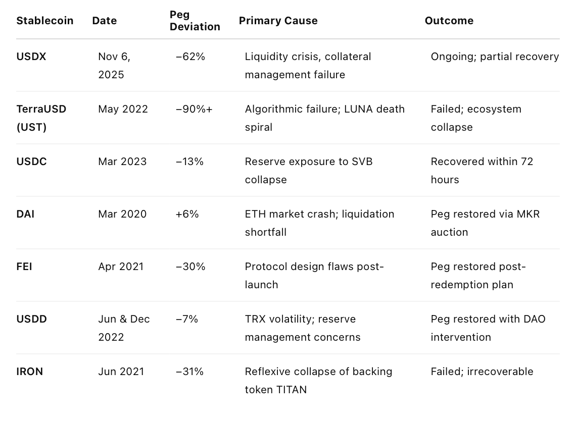 USDX崩盘再次打破了美元锚定数字资产作为避风港的市场认知。下表为重大稳定币脱锚事件的成因与结果对比分析: