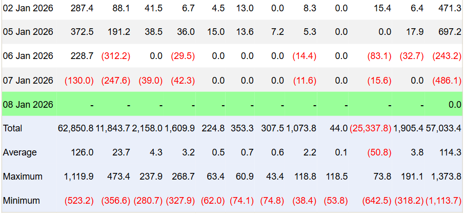 新年伊始常常会引发一波资本重新配置的浪潮。许多机构投资者会在上一年年底出于税务目的(包括税务损失收割)减持头寸,然后在年初重新买入。这种“新年反弹”效应往往导致一月初出现大规模资金流入,这有助于解释2026年首个交易日比特币和以太坊ETF的激增。