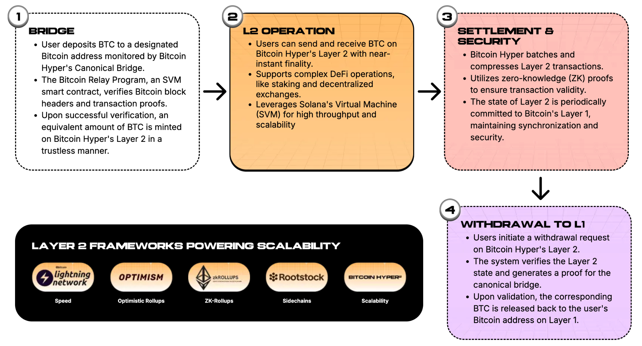 该项目正在开发比特币二层网络,旨在解决主网交易速度慢、功能有限等痛点。通过采用Solana虚拟机(SVM)技术,Bitcoin Hyper可实现每秒数千笔交易(TPS)的处理能力,并支持智能合约,为高级DeFi应用和消费者级dApp开辟道路。此外,项目还将通过ZK-rollups技术定期向比特币主网(L1)提交状态报告,确保交易继承与比特币主网同等级别的不可篡改性和中立性。