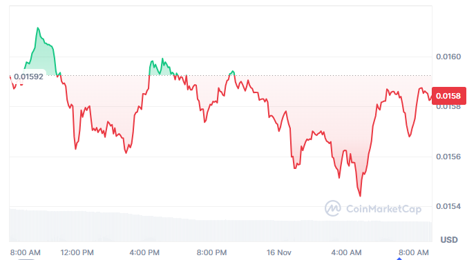 日内图表显示VET处于弱势震荡,价格已跌破11月上旬形成的小型烛台顶部。虽短暂触及0.01599美元高点,但随后形成逐步下移的高点序列,卖方缺乏持续发力动能。