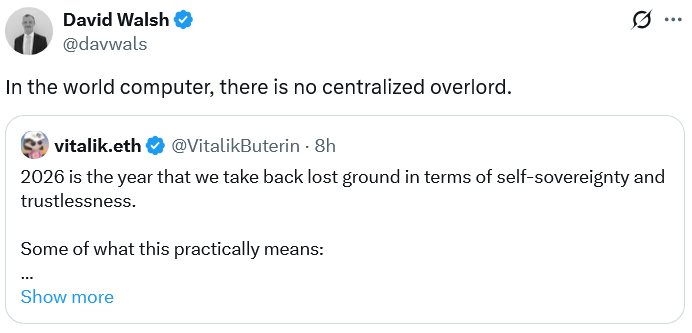 “2026年将是我们收复自主权与免信任领域失地的一年,”布特林周五在X平台发文强调,“从今往后,以太坊至此做出的所有价值妥协——每一个可能让你怀疑‘为迎合主流是否值得如此稀释自我’的时刻——都将被终结。”
