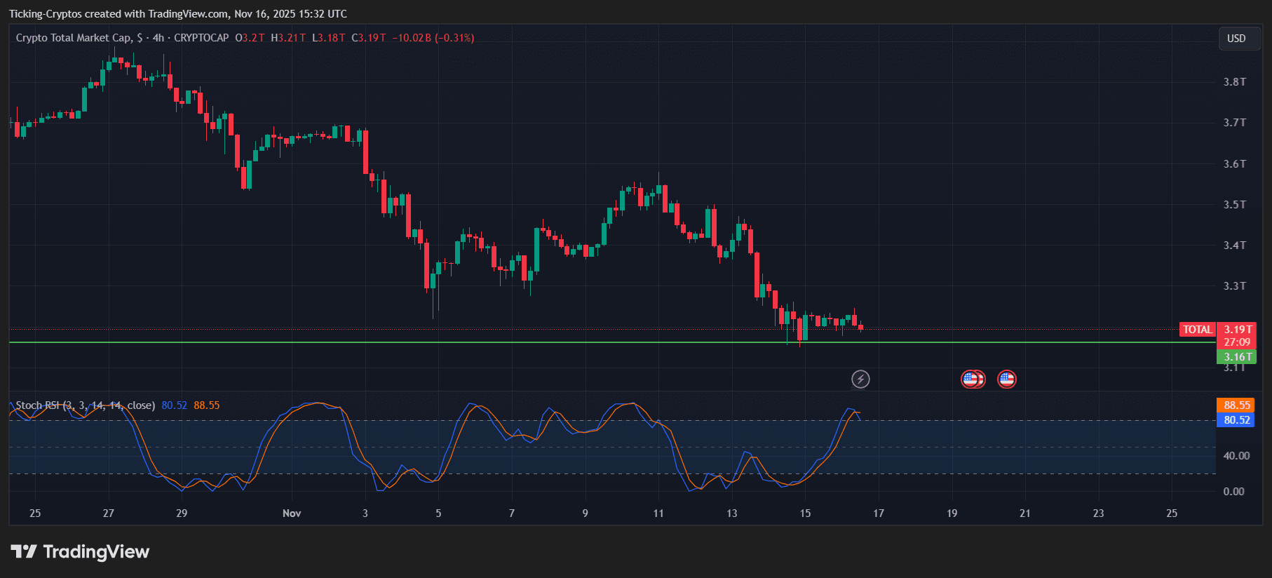 本周加密货币市场遭受重创,随着比特币价格暴跌,市场情绪全面走低。从总市值图表来看,价格正徘徊在关键支撑区域上方,多次反弹尝试均告失败——这明确显示出市场正承受看跌压力。与此同时,随机相对强弱指数(Stochastic RSI)仍处于超买区域,表明市场动能消退,正在等待决定性方向。