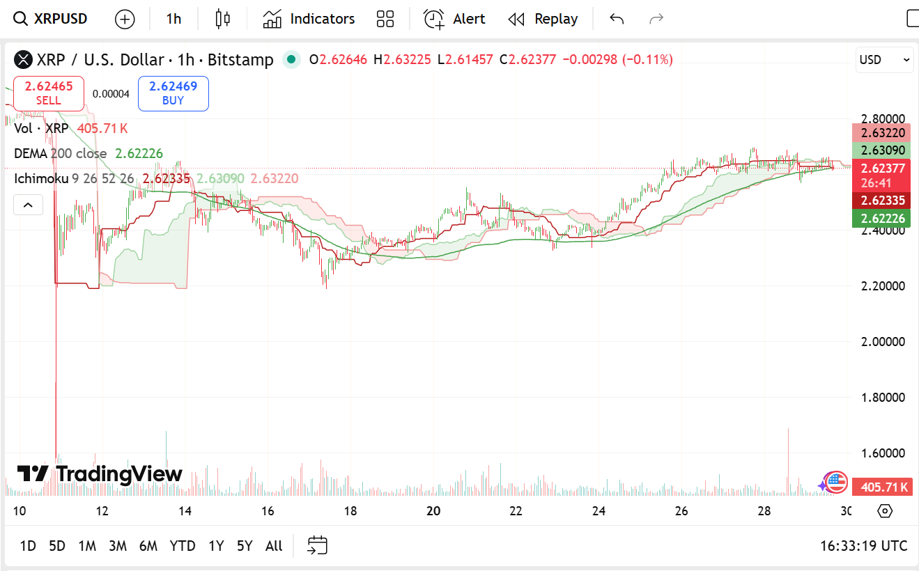 作为跨境结算市场中结算量最大的区块链货币,瑞波币(XRP)当前报价2.61美元,24小时微跌0.76%,总市值达1571.9亿美元。其24小时交易量为49.1亿美元,在经历一个月的强劲上涨后,短期持有者获利了结仅导致交易量小幅下降2.47%。
