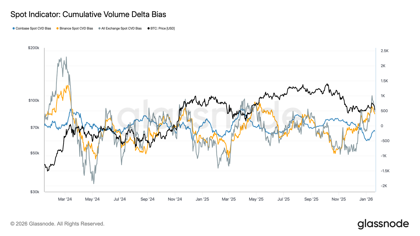 Glassnode数据显示比特币现货市场出现改善迹象。币安及交易所聚合累计成交量差值已转向买方主导状态,同时Coinbase的抛压趋于稳定。从技术角度看,上方供应的减少本应稳定价格,但当前买入力度仍显不足。