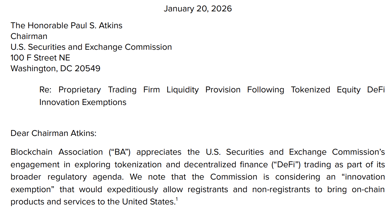 第二份提案来自区块链协会交易公司工作组。该组织敦促美国证券交易委员会明确,对于那些仅为自身账户交易代币化证券或DeFi资产、不招揽客户、不持有客户资金或不为他人执行交易的公司,不应根据《证券交易法》自动归类为“交易商”。该组织还指出,现有的经纪自营商监管规则是为传统市场建立的,可能需要调整以适应基于智能合约的结算和链上市场结构。