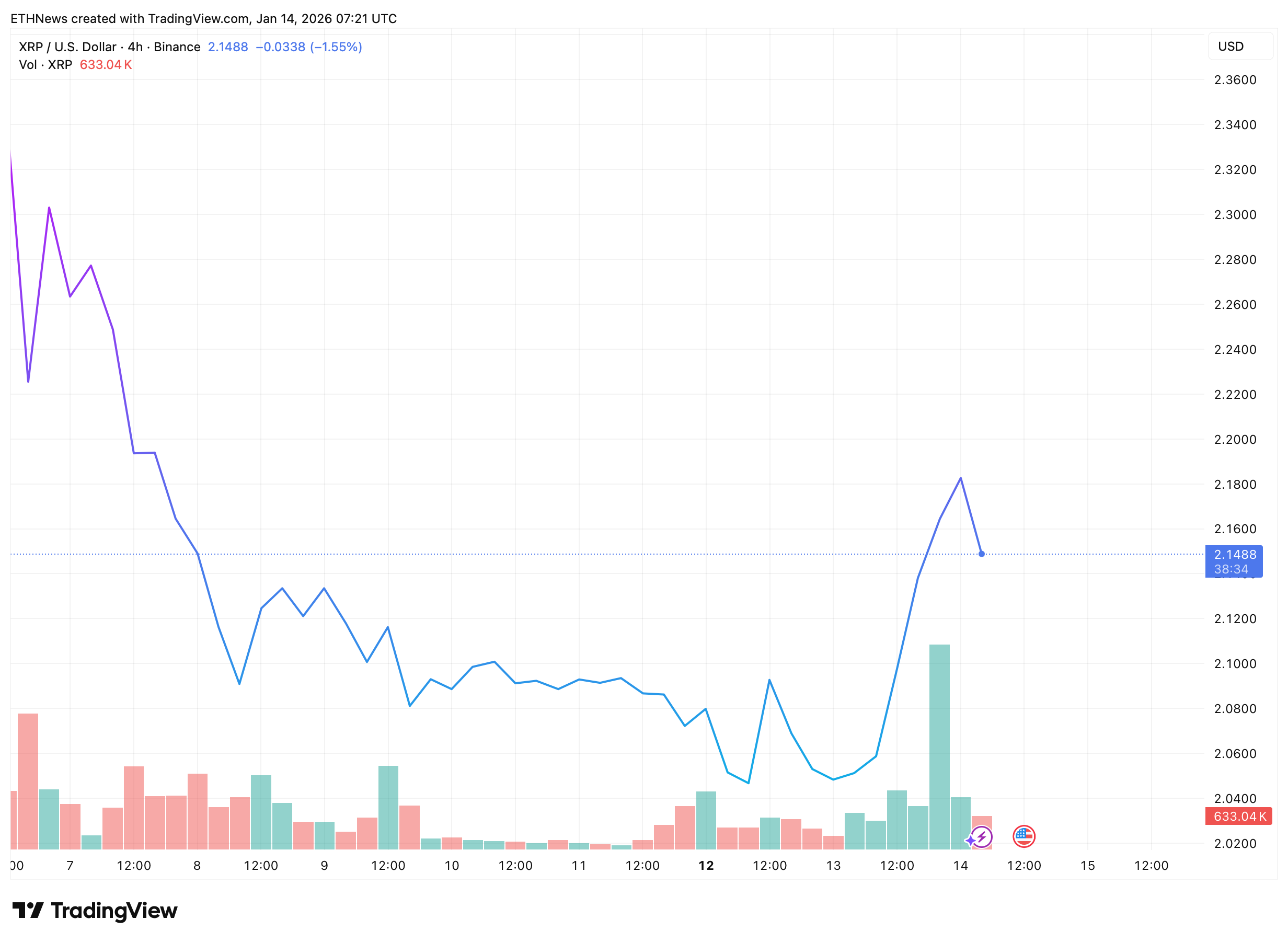 根据最新4小时图表显示,XRP在过去24小时内实现显著回升,从2.05美元附近的局部低点反弹至日内高点2.18美元上方,随后回撤并稳定在2.15美元区间。虽然价格未能维持高位,但这标志着自一月初以来最强劲的上行反应,并中断了连日来的低点下移趋势。