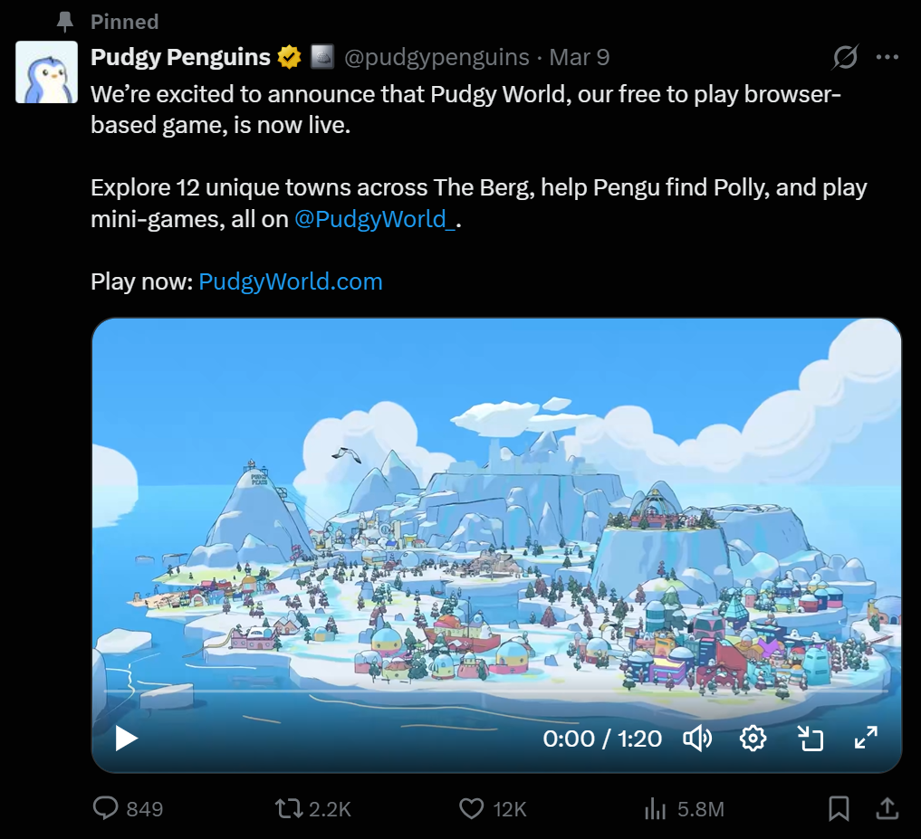 3月9日,胖企鹅项目正式推出以任务系统和迷你游戏为核心的浏览器游戏《胖企鹅世界》,游戏内含12个城镇构成的地图“伯格”。据CoinDesk报道,游戏上线后PENGU代币瞬时上涨9%,胖企鹅NFT地板价同步攀升。但CoinMarketCap数据显示该代币当周最终下跌超4%,市值约为4.5亿美元。