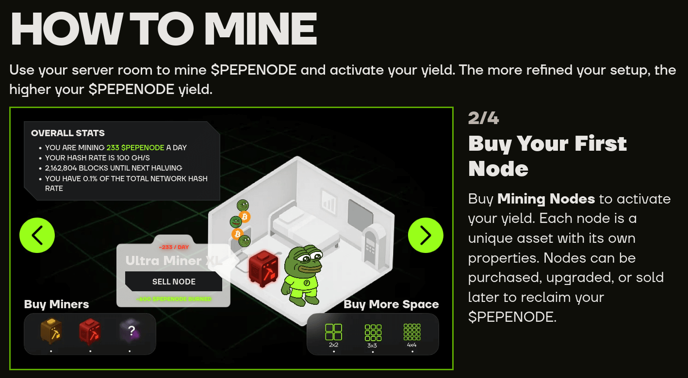 该项目巧妙融合了Meme币热潮与虚拟挖矿实用场景:用户通过浏览器搭建虚拟矿场,配置矿机节点设施,提升模拟算力获取奖励。$PEPENODE作为ERC-20代币既是以太坊网络保障安全,又通过智能合约管理矿机升级与游戏奖励。