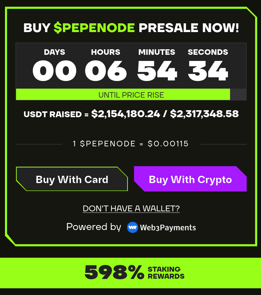 $PEPENODE预售已突破210万美元,当前代币价格0.00115美元(初始价0.001美元)。预售买家可立即享受598%年化质押收益,该APY随资金池扩大动态下降。