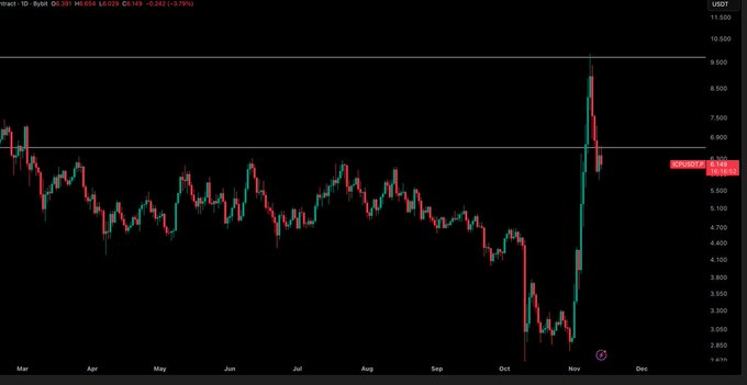 若ICP持续承压于6.60美元下方,市场可能进入盘整。这种区间既可能形成中级支撑平台,也可能构筑看涨旗形,使近期涨势获得消化空间而不破坏10月建立的总体结构——此类形态常见于垂直扩张之后。